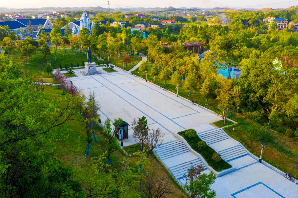 松坡广场坐落在苍松翠柏,群山掩映之中,广场正中央树立蔡锷铜像,为社会捐赠而设立,铜像高6米5,底座高3米4,通高9米9,寓意着蔡锷在1911年的农历九月初九日领导云南辛亥“重九起义”成功,一举推翻了清王朝在云南的封建统治,开启了民主共和的新纪元;蔡锷铜像系全身站立像,身穿北洋将官礼服,手执永增军刀,胸前佩戴着其生平为国家建功立业而荣获的五枚勋章,蔡锷神情严肃,凝视南方,巍然挺立,成功再现了蔡锷决定拔剑南天,护国讨袁时的光辉形象。蔡锷的恩师梁启超先生所题“蔡锷”二字镌刻在具有民国风的基座上,光辉夺目。